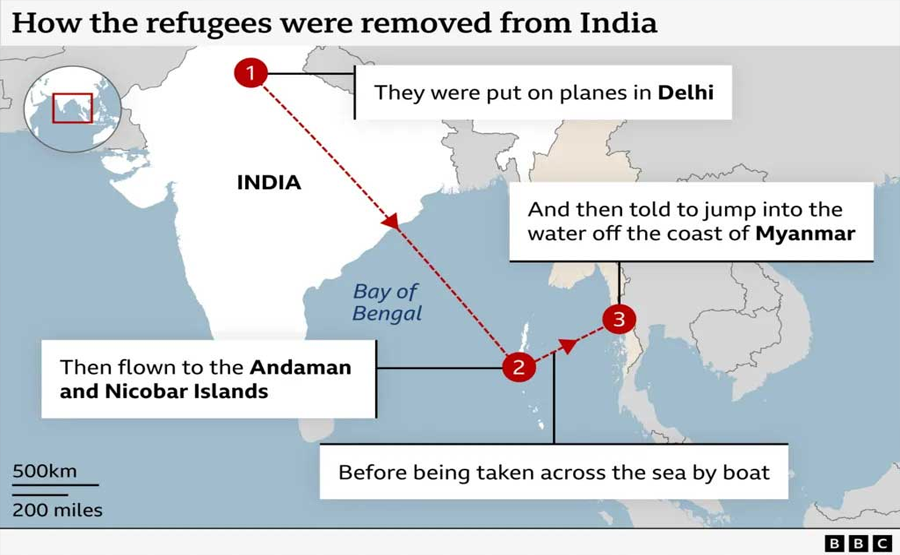 ব্রিটিশ সংবাদমাধ্যমটি লিখেছে, দিল্লি থেকে উড়োজাহাজে করে এই রোহিঙ্গা শরণার্থীদের বঙ্গোপসাগরের একটি দ্বীপে নেওয়া হয়। এরপর একটি নৌযানে উঠিয়ে ‘লাইফ জ্যাকেট’ পরিয়ে আন্দামান সাগরে জোর করে নামিয়ে দেওয়া হয়। ভাসতে ভাসতে এসব রোহিঙ্গারা গিয়ে ঠেকেন মিয়ানমারের তীরে। সেখানে এখন তারা অনিশ্চিত ভবিষ্যতের মুখোমুখি।